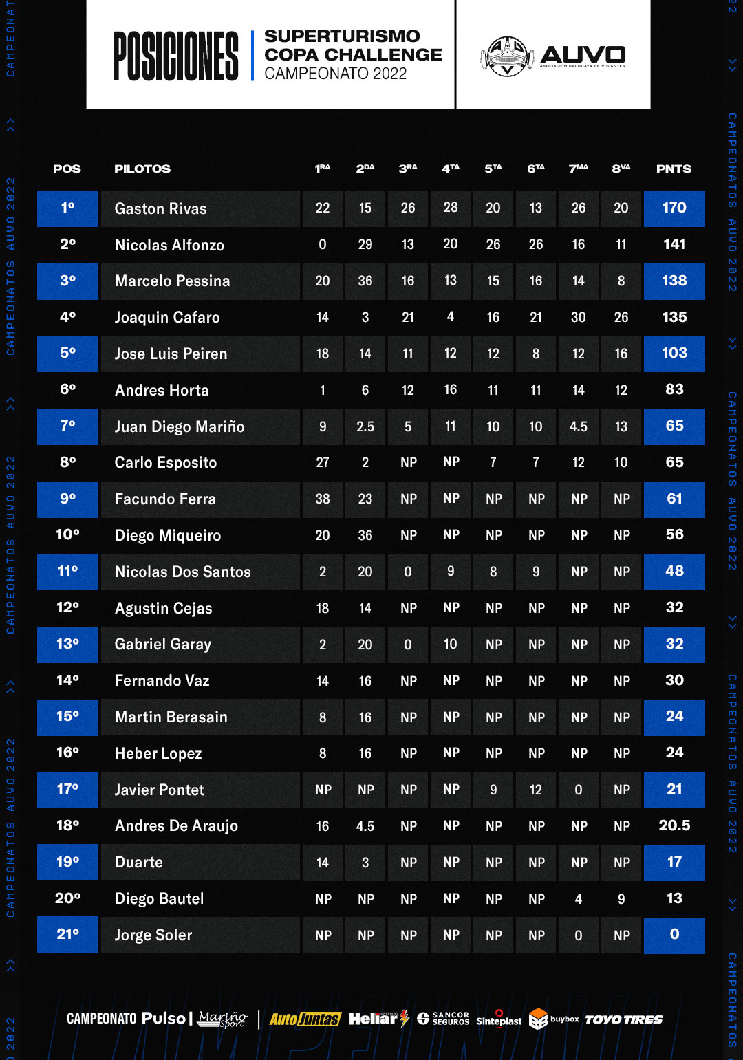 Gastón Rivas con 170 puntos sigue liderando la Copa Challenge luego del fin de semana en Rivera, lo sigue Nicolás Alfonzo con 141, Marcelo Pessina con 138, Joaquín Caffaro 135, José Peirén con 103.