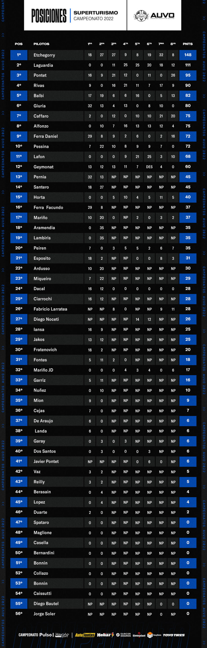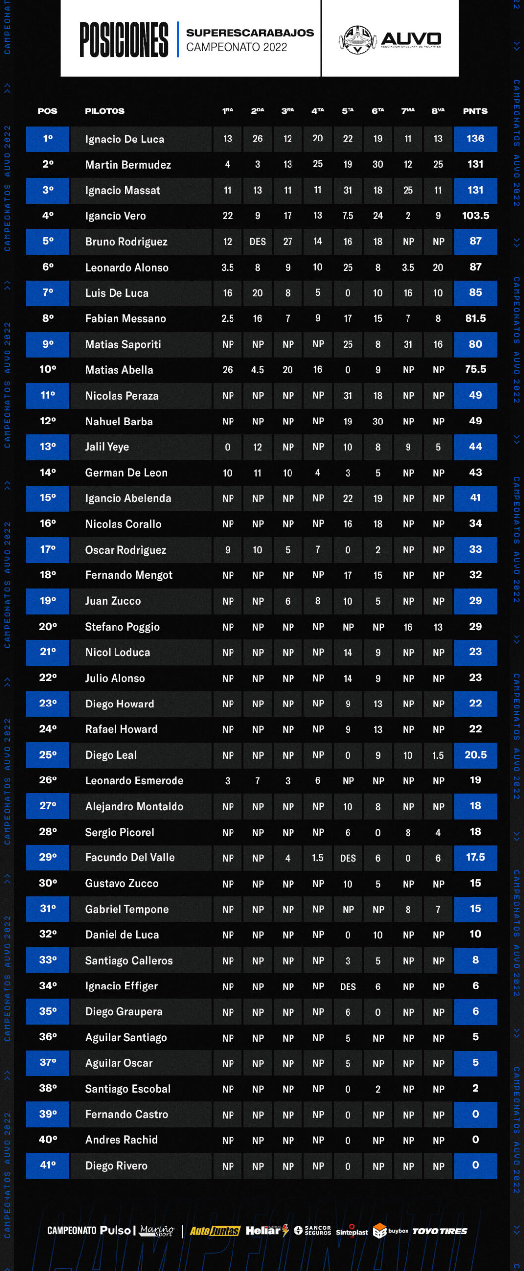 Ignacio De Luca sigue primero al cierre de la 8va fecha con 136 unidades, segundo está Martín Bermúdez con 131, tercero Ignacio Massat con 131, del cuarto al décimo, Vero, Rodríguez, Alonso, De Luca, Messano, Saporiti y Abella.