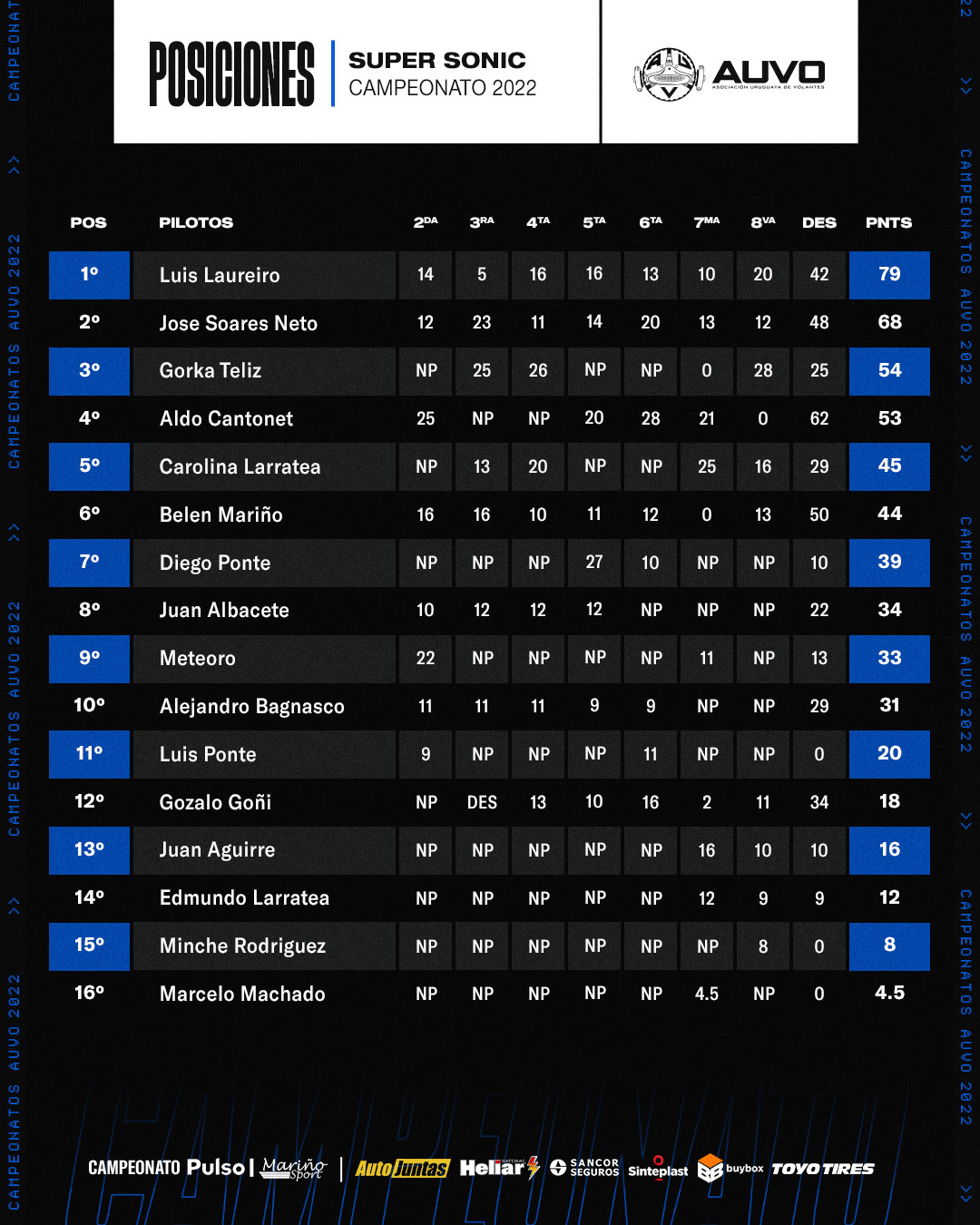 Vuelve desde Rivera conservando el primer lugar Luis Laureiro con 79 unidades, seguido por José Soares Neto con 68, tercero Gorka Téliz con 54, del cuarto al décimo se ubican, Cantonnet, Larratea, Mariño, Ponte, Albacete, Meteoro y Bagnasco.