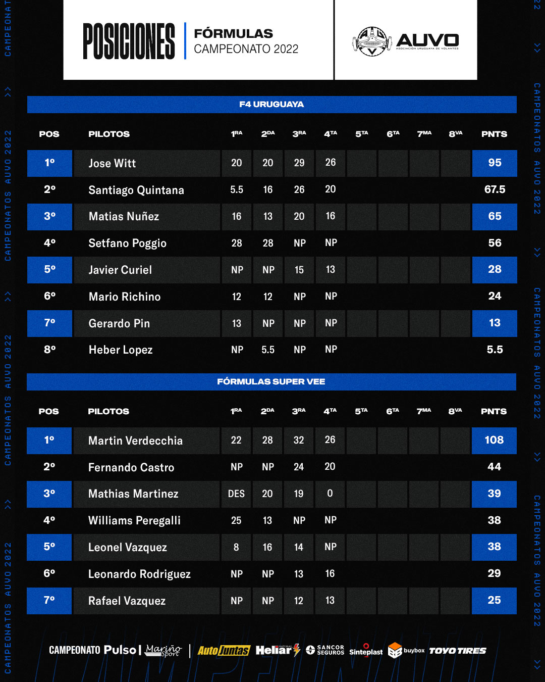 Luego de la disputa de la 3ra y 4ta fecha en Rivera y con la ausencia de Stéfano Poggio quien participó en SE, accede al primer lugar José Witt, de destacado fin de semana con 95 unidades, seguido por Quintana, Núñez, Poggio y Curiel en los 5 primeros puestos.