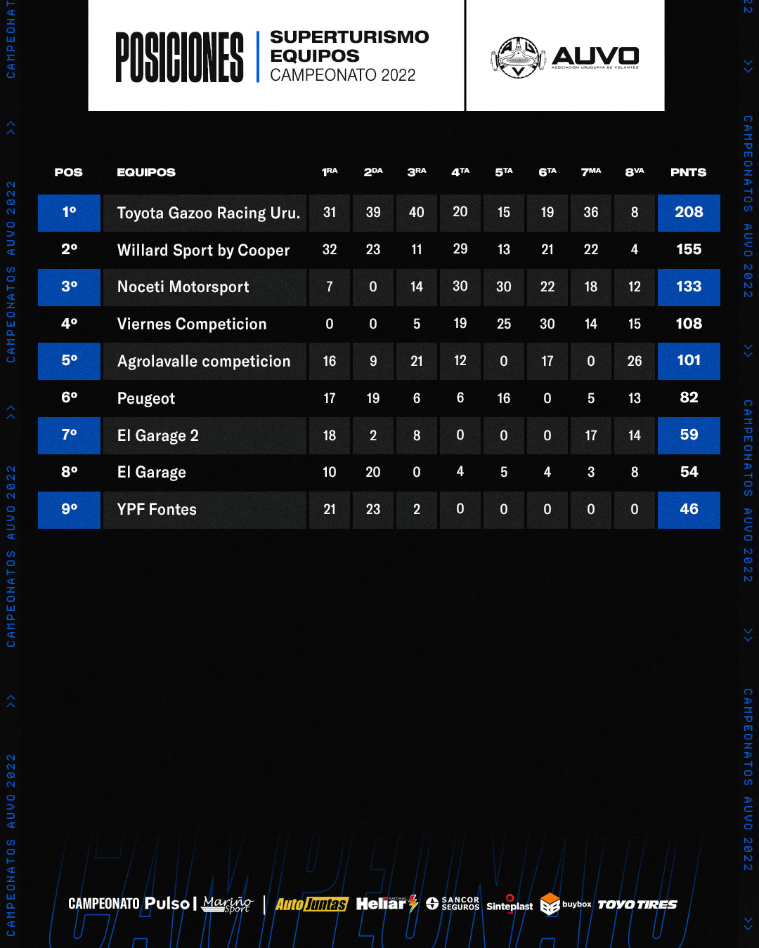 Toyota Gazoo Racing continúa liderando por equipos, seguido por Willard Sport By Cooper, Noceti Motorsport, Viernes Competición y Agrolavalle Competición en los cinco primeros puestos.