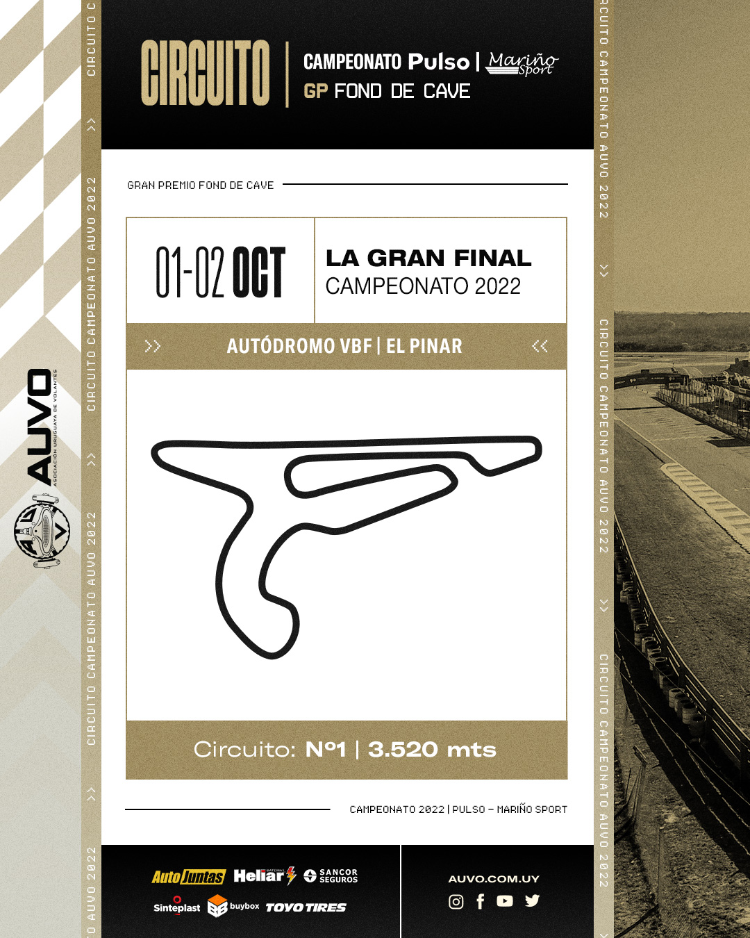 Desde hoy y hasta el martes 8 de noviembre comienzan las inscripciones de pilotos participantes para la disputa de la semifinal y final de los Campeonatos Nacionales de Pista “Pulso/ Mariño Sport”, en el marco del Gran Premio “Fond de Cave” que se llevará adelante en el circuito Nro. 1 del autódromo Víctor Borrat Fabini de El Pinar.