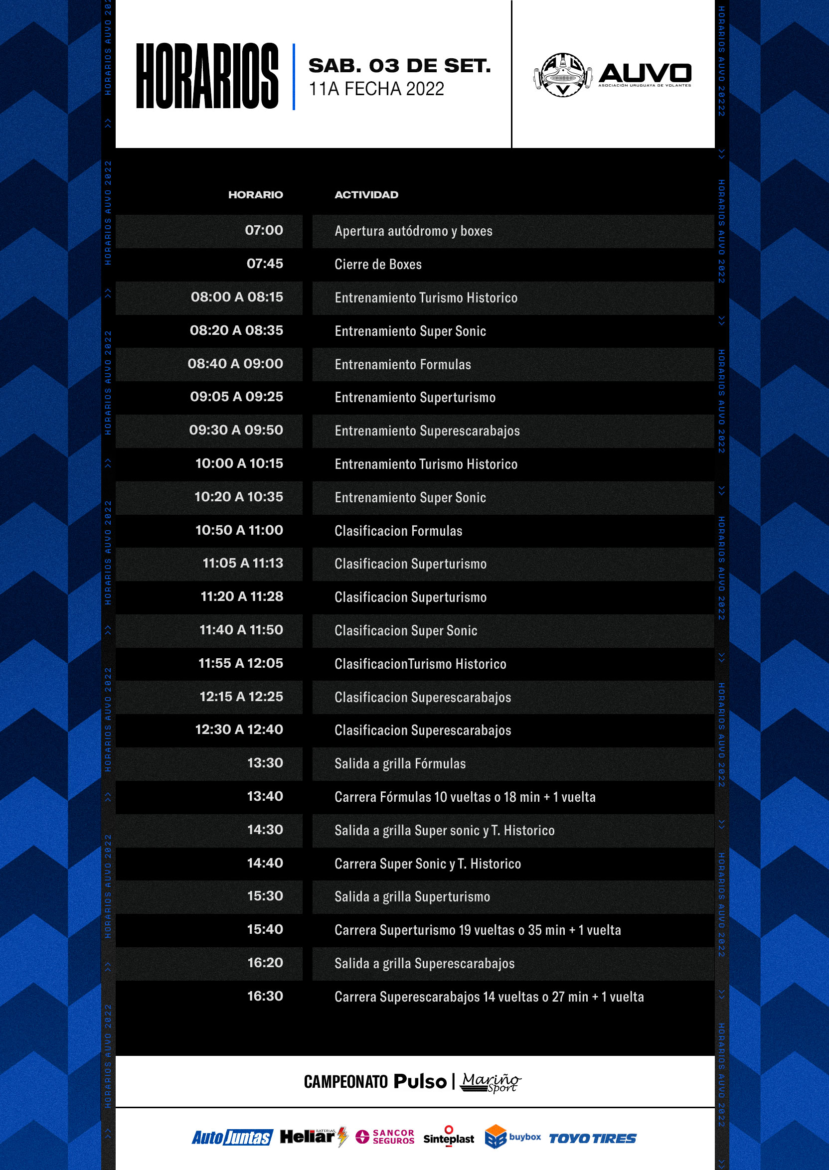 Domingo muy intenso desde las 08:00 a 08:45 se desarrollarán los Warm Up de todas las categorías, clasificarán de 09:00 a 10:35, competencias finales desde las 11:10 Superescarabajos, 11:55 final de Superturismo, 12:45 Turismo Histórico y Súper Sonic, cierran el evento las Fórmulas desde las 13:50 horas.