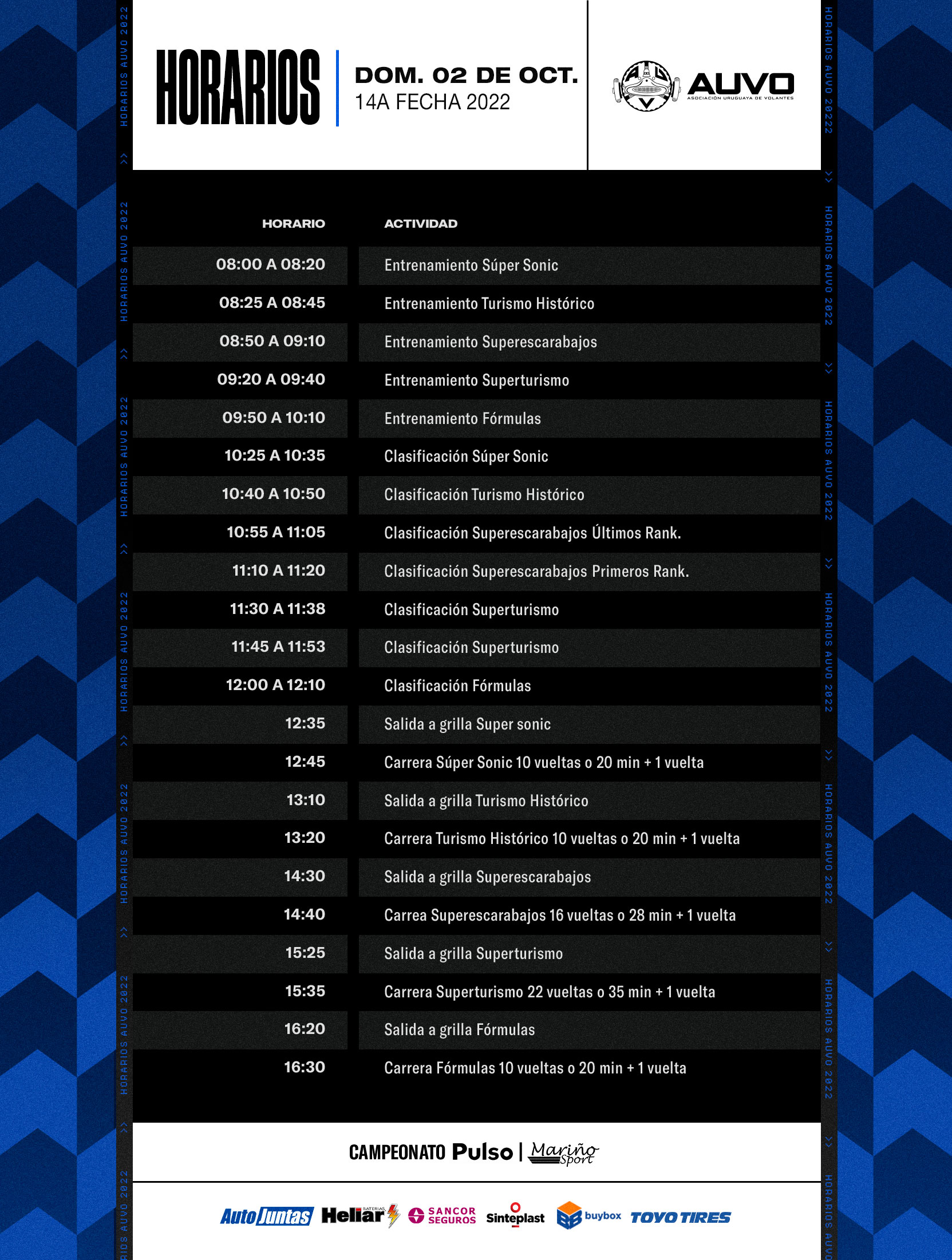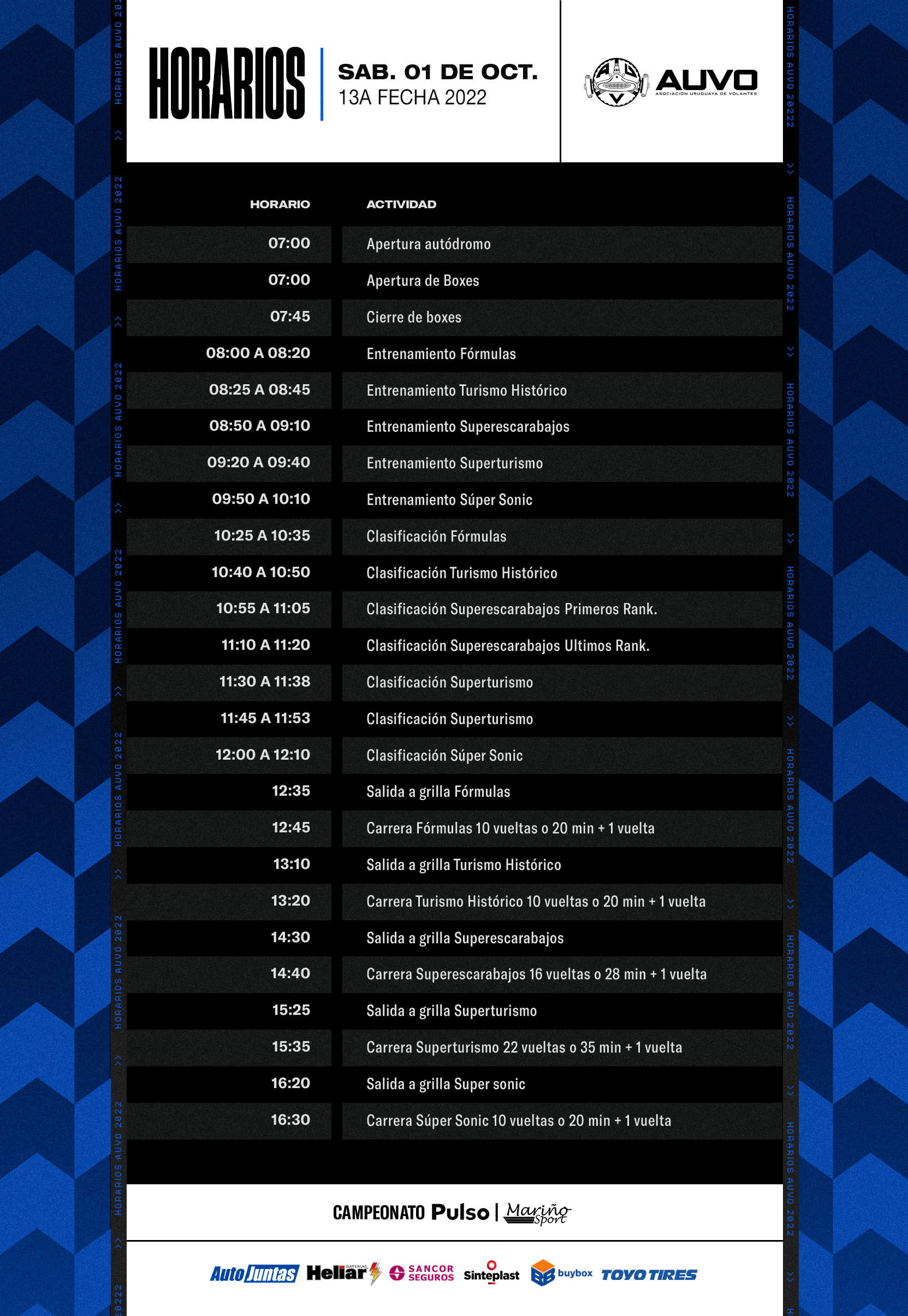 Entrenamientos de 08:00 a 10:10, clasificaciones de 10:25 a 12:10, finales a partir de las 12:45 Fórmulas, 13:20 Turismo Histórico, 14:40 Superescarabajos, 15:35 Superturismo y cierra la actividad desde las 16:30 Súper Sonic.