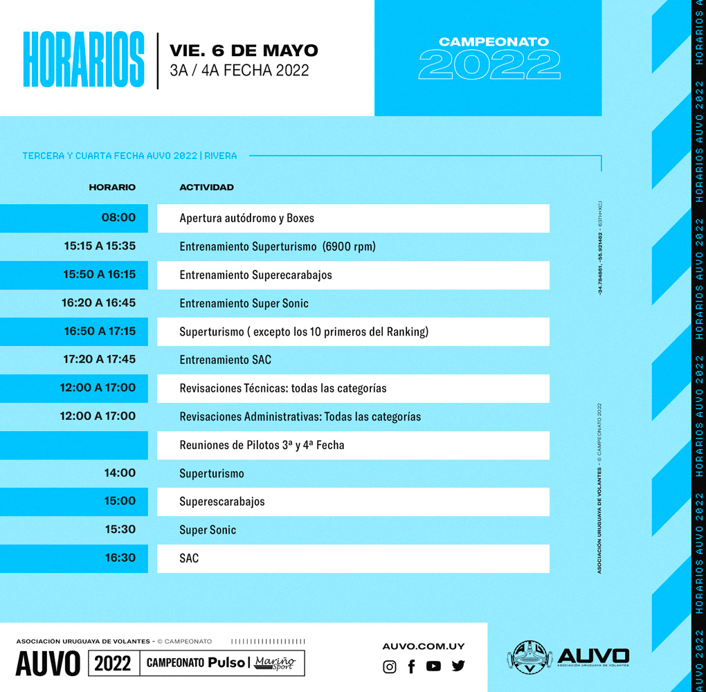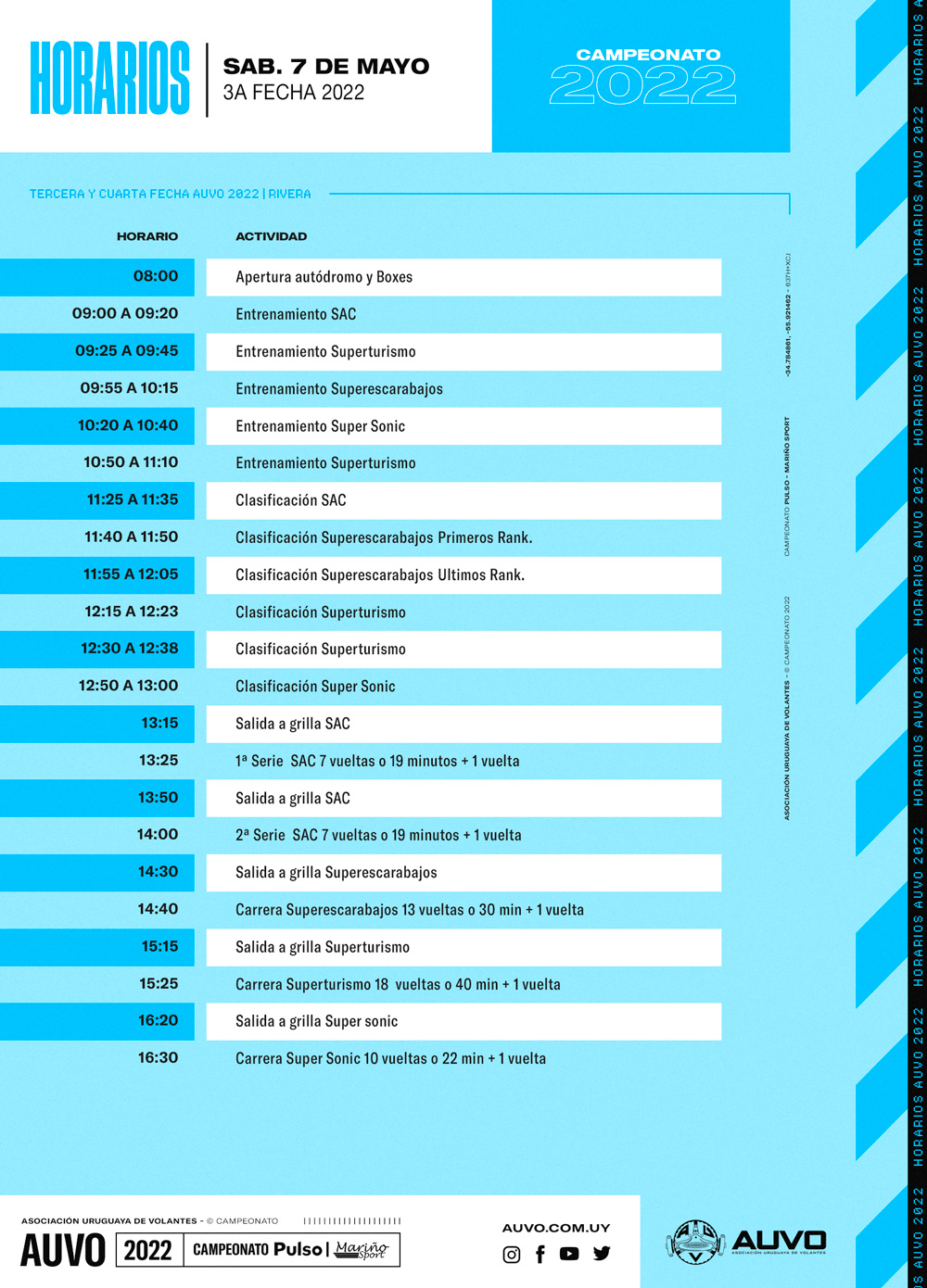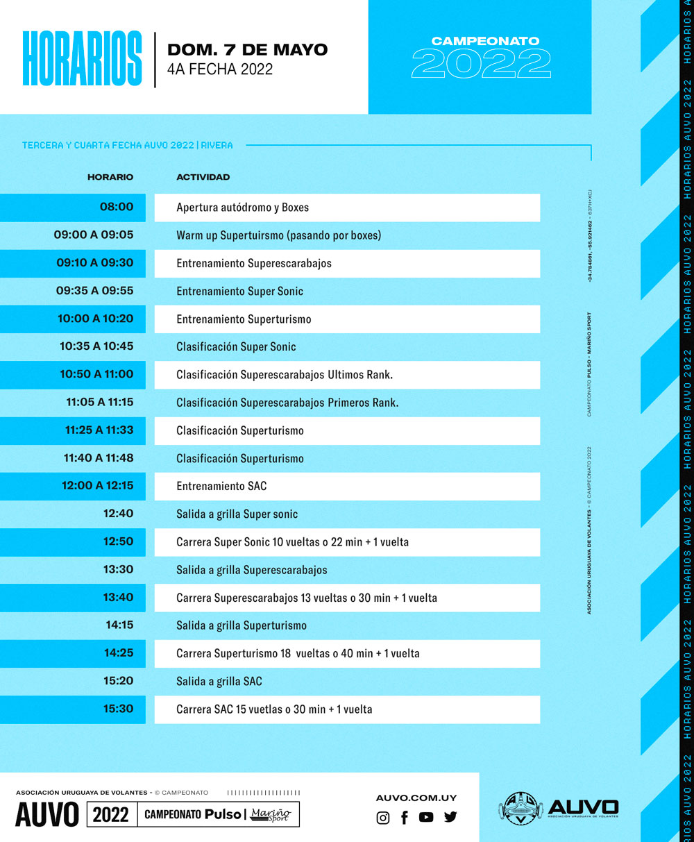 El domingo tiempo de vivir la 4ta fecha del año, de 09:00 a 10:20 entrenamientos, 10:35 a 12:15 clasificaciones y entrenamiento de SAC, finales a las 12:50 Súper Sonic, 13:40 Superescarabajos, 14:25 Superturismo y cierra el espectáculo a las 15:30 SAC con la 2da fecha de sus campeonatos.