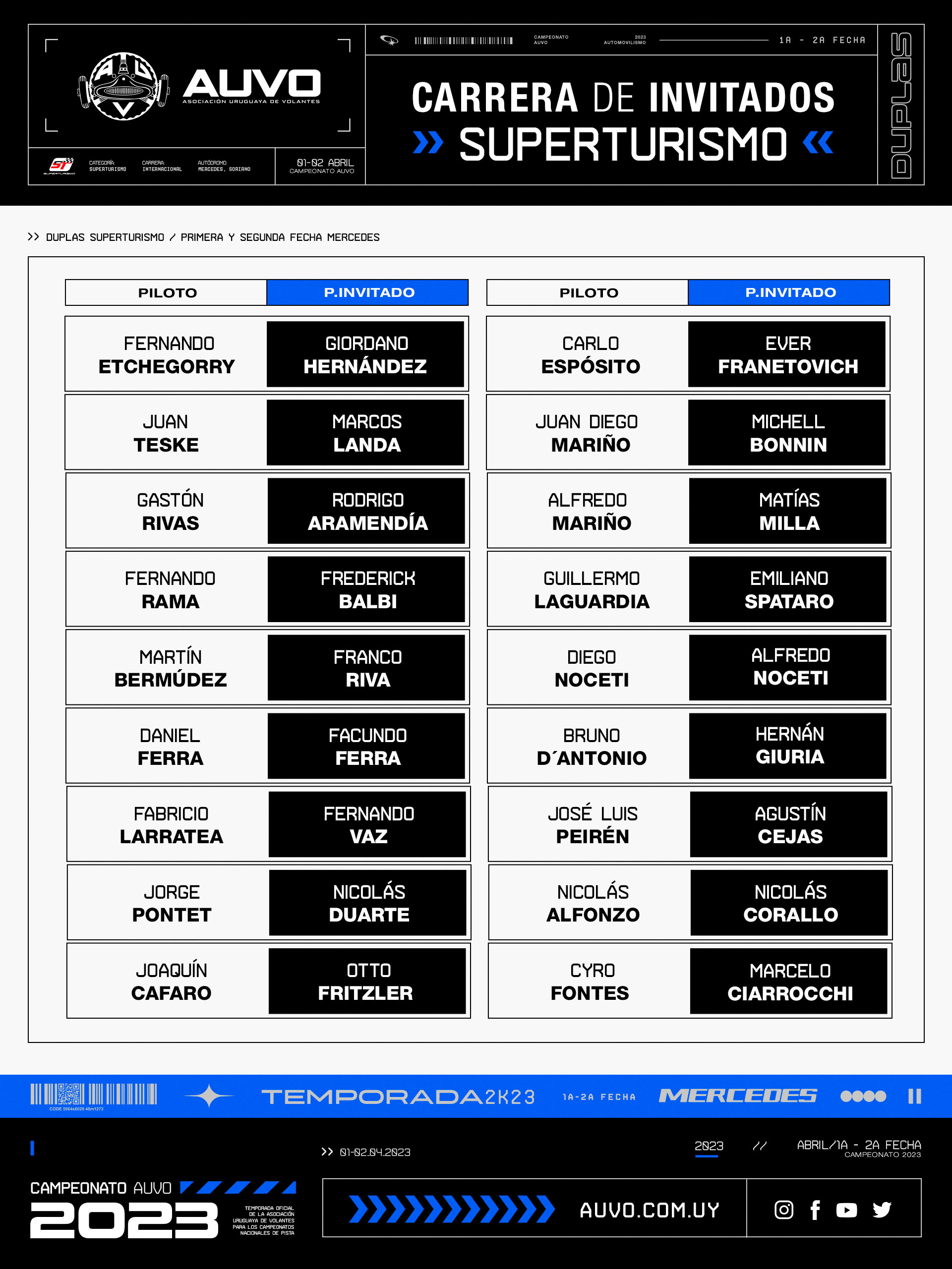 Con la participación de Fontes se eleva la lista a 18 duplas, con 36 pilotos, espectáculo asegurado en la reinauguración del Polideportivo Ciudad de Mercedes.